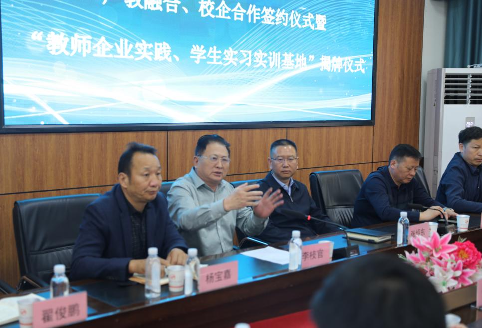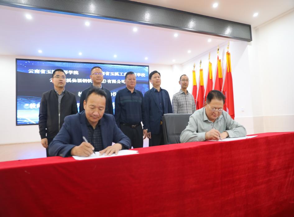 云南玉溪仙福鋼鐵(集團)有限公司李枝官總經理和云南省玉溪技師學院楊寶嘉院長、雙方進行“產教融合、校企合作”簽約。